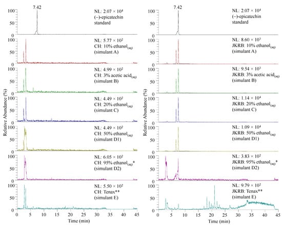 SIM chromatograms of (−)-epicatechin (tr at 7.42 min) acquired for stock solutions of liquid food simulants (about 77 mg of biofoil per 20 mL of food simulant after 1 h of contact) analyzed directly, except simulant D (3-fold concentrated) * and extract of simulant E (10-fold concentrated) **. SIM chromatogram of the standard (−)-epicatechin is shown at the top of each column for comparison. Abbreviations: CH—chitosan biofoil; JKRB—JKRB biofoil.