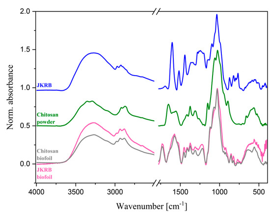 ATR-FTIR analyses of JKRB, chitosan powder, and chitosan (blank) and JKRB biofoils were carried out to observe the interaction between the compounds. The spectra were recorded on Spectrum Two (Perkin Elmer, Rodgau, Germany) from wavenumber 4000 cm−1 to 400 cm−1 with a step of 4 cm−1, accumulating 32 scans.