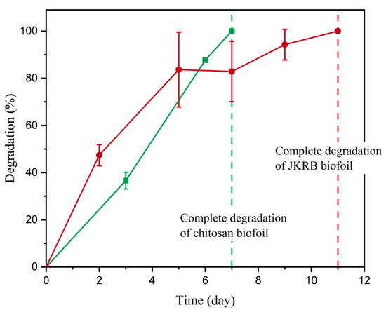 Chitosan (blank) and JKRB biofoils were exposed to animate and inanimate activity in industrial compost with a moisture content of 49.0 ± 4.0%. The JKRB biofoil degraded over a period of 11 days, while the chitosan biofoil fully deteriorated in 7 days (Figure 8), which was in accordance with the previous studies [29]. The antioxidant properties and the repellent effect on microorganisms obtained via the incorporation of JKRB were most possibly responsible for the longer degradation rate of JKRB biofoil. However, in the first five days, the degradation of the JKRB biofoil was faster than the chitosan biofoil, which could be attributed to the higher proportion of water-soluble matter which is responsible for fast mass loss in the initial stages of degradation. Further, the antioxidant extract disrupts the hydrogen bonding between chitosan chains by establishing new bonds with JKRB, which results in lower density, thus making the surface more susceptible to the attack of microorganisms. During the process of degradation, the material is first mechanically disintegrated into fragments which are then mineralized by microorganisms or further fragmented under UV and thermal influence without final conversion to inorganic carbon. The identification and quantification of the latter are out of the scope of the applied method.