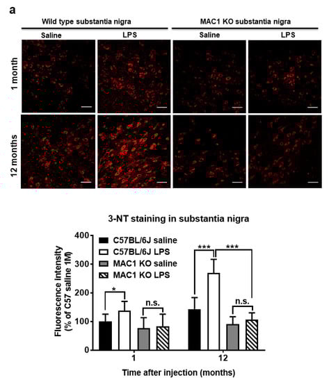 Persistent elevation of brain level of oxidative stress was ameliorated in MAC1 KO brains. Brain slides from C57BL/6J and MAC1 KO mice were collected at 1 or 12 months after saline or LPS injection (N = 3 in each group and time point). Three brain slides from each group were stained with 3-nitrotyrosine (3-NT), an oxidative stress marker. (a) 3-NT staining in substantia nigra and (b) hippocampal dentate gyrus. Scale bar in (a) = 50 μm, in (b) = 100 μm. * p < 0.05, *** p < 0.001.