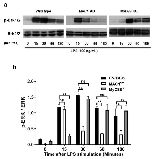 The molecular mechanism underlying the coupling of MAC1-mediated NOX2 remains unclear. The purpose of the study was to search for potential signal molecules mediating p47phox phosphorylation and translocation. Among the different protein kinases screened, we found that ERK1/2 played a crucial role. We demonstrated that ERK1/2 phosphorylation in wild-type microglia was significantly increased at 15 min after LPS stimulation, peaked at 30 min, and maintained at high levels up to 3 h. By contrast, LPS-elicited ERK1/2 phosphorylation was only transiently increased at 15 min; intensities of phosphorylation rapidly declined after 30 min of stimulation. Since TLR-4 is also known involved in ERK1/2 phosphorylation, we compared the pattern of phosphorylation of MAC1- and MYD88-deficient microglia side by side. In contrast to the pattern shown in MAC1-deficient microglia, in MyD88 deficient microglia, LPS-elicited Erk1/2 phosphorylation was not observed until 30 min after LPS stimulation but was able to maintain significant high levels up to 3 h (Figure 6a,b). These data suggest that LPS-elicited increase in ERK1/2 phosphorylation during the first 15 min could be initiated by TLR4 activation, and the long-lasting of ERK1/2 phosphorylation could be mediated by MAC1 activation.