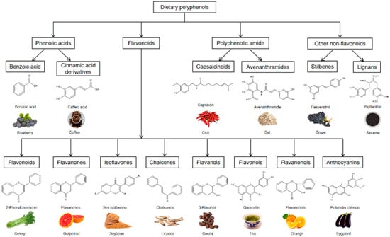 Dietary polyphenols are one of the most abundant and widely distributed natural products in plants. At present, according to the structure, dietary polyphenols are divided into four categories: phenolic acids, flavonoids (the largest subclass of polyphenols), polyphenolic amide, and other non-flavonoids (Figure 1). Phenolic acids can be further divided into two main types, benzoic acid and cinnamic acid derivatives based on C1–C6 and C3–C6 backbones []. Flavonoids include flavonoids, flavanones, isoflavones, chalcones, flavanols, flavonols, flavanonols, anthocyanins, and so on []. Polyphenolic amides have N-containing functional substituents, two such groups are capsaicinoids and avenanthramides. The non-flavonoids include mainly stilbenes and lignans. In addition to phenolic acids, flavonoids, and phenolic amides, there are several non-flavonoid polyphenols found in foods that are considered important to human health, such as resveratrol, ellagic acid and its derivatives, curcumin, etc. The remarkable feature of the chemical structure is that it has a different amount of phenolic hydroxyl groups, which can be divided into phenolic monomers and polymerized polyphenols. Phenolic monomers include flavonoids and non-flavonoids. The former generally involves a common carbon skeleton of diphenyl propane in which two benzene rings are connected by a linear three-carbon chain, while the latter is two benzene rings connected by the vinyl group []. Polymeric polyphenols are oligomers or polymers polymerized by monomers known as tannins.