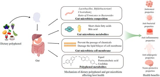 It has been reported that most dietary polyphenol intake remains unabsorbed in the small intestine, while the unabsorbed parts may accumulate in the large intestine and are extensively metabolized by the gut microbiota []. Therefore, intestinal microbiota play an important role in the biotransformation and metabolism of the original polyphenolic structures into low-molecular-weight metabolites, which can be readily absorbed and contribute to host healthy benefits. However, little is currently known regarding the possible mechanism among dietary polyphenols, gut microbes, and host health.