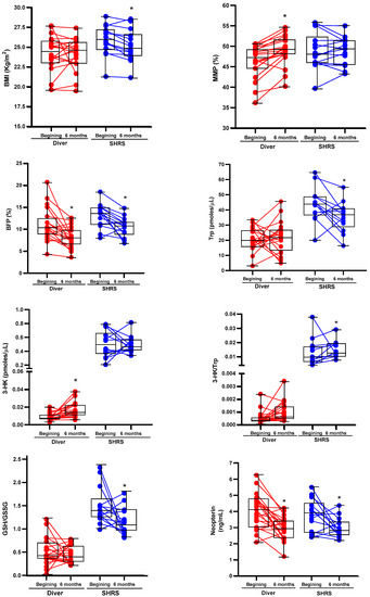 Boxplots associated with significant changes of BC, Trp catabolism and redox environment of divers and SHRSs after six of the military training program. The graphs also include the values at the beginning and at the end of program for each individual. * p < 0.05 vs. beginning, based on Wilcoxon signed-rank test.
