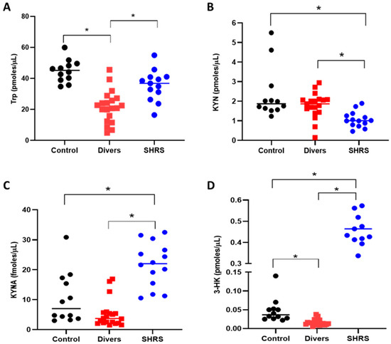 Effect of different types of exercise on serum KP metabolites: control (n = 12), diver (n = 20) and SHRS (n = 14) groups. (A) Trp serum levels, (B) KYN serum levels, (C) KYNA serum levels and (D) 3-HK serum levels. Data are represented by the median. * p < 0.05 based on the Kruskal–Wallis test with Dunn’s test for multiple pairwise comparisons.