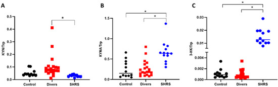 Effect of different types of exercise on serum KP ratios: control (n = 12), diver (n = 20) and SHRS (n = 14) groups. (A) KYN/Trp ratio, (B) KYNA/Trp ratio and (C) 3-HK/Trp ratio. Data are represented by the median. * p < 0.05 based on the Kruskal–Wallis test with Dunn’s test for multiple pairwise comparisons.