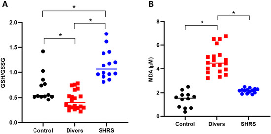 Effect of different types of exercise on serum redox environment: control (n = 12), diver (n = 20) and SHRS (n = 14) groups. (A) GSH/GSSG ratio and (B) MDA serum levels. Data are represented by the median. * p < 0.05 based on the Kruskal–Wallis test with Dunn’s test for multiple pairwise comparisons.