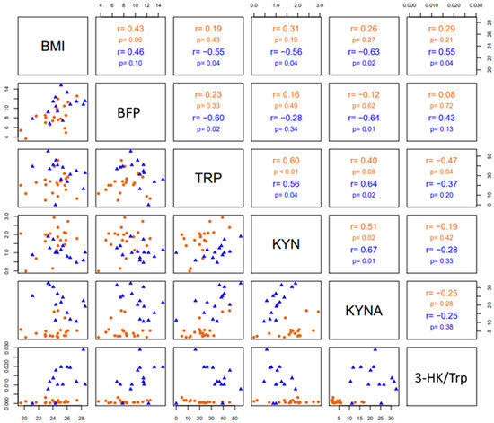 Pairwise correlations among BMI, BFP, Trp, KYN, KYNA and the 3-HK/Trp ratio are shown in Figure 5. In both groups (divers and SHRS), Trp levels (pmoles/µL) correlated positively with KYN levels (pmoles/µL), as well as KYN with KYNA (fmoles/µL) circulating levels. In SHRS, Trp levels correlated positively with KYNA levels, and BMI with the 3-HK/Trp ratio; additionally, there was a negative correlation of BMI with KYNA, KYN and Trp levels, as well as of BFP with KYNA and Trp levels. Finally, Trp levels correlated negatively with the 3-HK/Trp ratio in divers.
