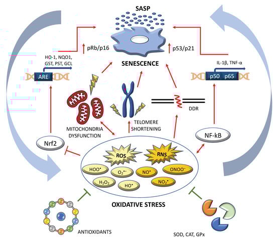 The interplay between oxidative stress (OS) and senescence. Excessive reactive oxygen species (ROS) and reactive nitrogen species (RNS) trigger senescence through different mechanisms: (i) via NF-kB stimulation, which induces the transcription of the main factors composing the senescence-associated secretory phenotype (SASP); (ii) through DNA double strand brakes, which trigger a sustained DDR response; (iii) via telomere shortening, which is directly linked to cellular senescence; (iv) through a double cross-talk between mitochondria dysfunction and ROS/RNS production and (v) via the inhibition of Nrf2, a crucial antioxidant transcription factor. Antioxidant molecules and antioxidant enzymes (i.e., superoxide dismutase, catalase and glutathione peroxidase) can counteract senescence through the inhibition of OS. Abbreviations: ARE: antioxidant responsive element; CAT: catalase; DDR: DNA damage response; GCL: glutamate cysteine ligase; GPx: glutathione peroxidase; GST: glutathione transferase; H2O2: hydrogen peroxide; HO-1: heme oxygenase-1; HO•: hydroxyl radical; HOO•: hydroperoxyl radical; IL-1β: interleukin 1β; NF-kB: nuclear factor kappa-light-chain-enhancer of activated B cells; NO•: nitric oxide radical; NO2•: nitrogen dioxide radical; NQO1: NAD(P)H quinone dehydrogenase 1; Nrf2: nuclear factor erythroid 2-related factor 2; O2•−: superoxide anion radical; ONOO−: peroxynitrite anion radical; PST: phenolsulfotransferase enzyme; SOD: superoxide dismutase; TNF-α: tumour necrosis factor α.