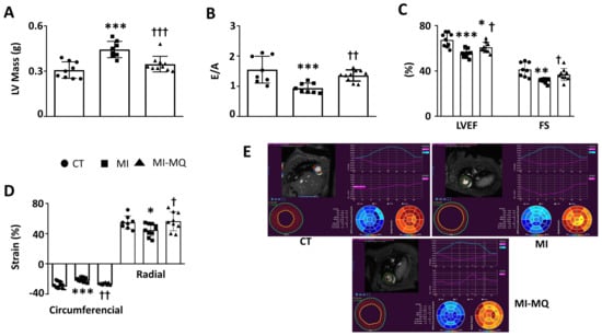 Mitochondrial oxidative stress mediates cardiac structural and functional alterations in infarcted rats. (A) Left ventricle mass; (B) E-wave and A-wave ratio (E/A); (C) left ventricle ejection fraction (LVEF) and fractional shortening (FS); (D) circumferential and radial strain; (E) representative image depicting myocardial segmentation and data analysis for global circumferential and radial strain evaluation using feature-tracking CMR imaging in control rats (CT) and rats submitted to myocardial infarction treated with vehicle (MI) or with the mitochondrial antioxidant MitoQ (MI-MQ; 50 mg/kg/day). Bar graphs represent the means ± SD of 8-10 animals. * p < 0.05, ** p < 0.01, *** p < 0.001 vs. CT group. † p < 0.05, †† p < 0.01, ††† p < 0.001 vs. MI group.