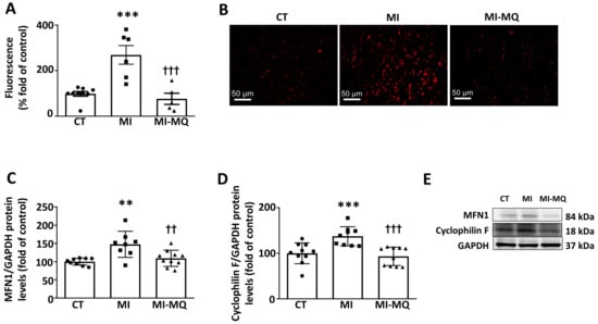 MI produced an oxidant environment characterized by an increase in superoxide anion levels (Figure 2A,B) that was prevented by MitoQ, supporting the effectiveness of the treatment (Figure 2A,B). In addition, MitoQ was able to prevent the mitochondrial alterations observed in MI rats, such as the upregulation in mitofusin 1(MFN1) and cyclophilin F levels (Figure 2C,D). Figure S5 shows the original blots corresponding to Figure 2E.