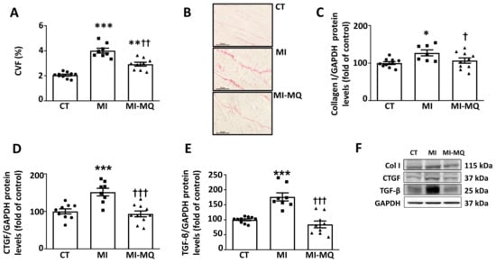 Mitochondrial oxidative stress mediates cardiac fibrosis in infarcted rats. (A) Quantification of collagen volume fraction (CVF); (B) representative microphotographs of cardiac sections stained with picrosirius red (magnification 40×). Protein levels of (C) collagen type I (Col I), (D) connective tissue growth factor (CTGF), and (E) transforming growth factor-beta (TGF-β) and (F) representative blots for protein expression in cardiac tissue from control rats (CT) and rats submitted to myocardial infarction treated with vehicle (MI) or with the mitochondrial antioxidant MitoQ (MI-MQ; 50 mg/kg/day). Bars graphs represent the means ± SD of 8–10 animals, normalized for glyceraldehyde 3-phosphate dehydrogenase (GAPDH). * p < 0.05, ** p < 0.01, *** p < 0.001 vs. CT group. † p < 0.05, †† p < 0.01, ††† p < 0.001 vs. MI group.
