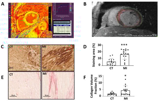 (A) A representative image of T1 map with MOLLI sequences of a patient with acute myocardial infarction; (B) a representative image of LGE quantification. The mean signal intensity was determined by drawing a region of interest (ROI) in a portion of the normal myocardium, and for comparison, a threshold technique was performed using 5 SDs above the mean signal intensity for the normal nulled myocardium. (C) Representative microphotographs of cardiac sections of BiP staining from patients with (MI) or without myocardial infarction (CT); (magnification 20×); (D) quantification of BiP staining in cardiac sections from patients with or without myocardial infarction; (E) representative microphotographs of cardiac sections staining with picrosirius red of patients with or without myocardial infarction (magnification 40×). (F) Quantification of collagen volume fraction (CVF) in cardiac sections of patients with or without myocardial infarction. * p < 0.05, *** p < 0.001 vs. CT group.