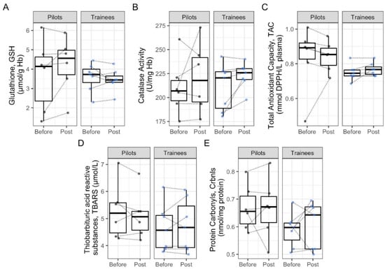The redox status of pilots was assessed through five distinct redox biomarkers in plasma and red blood cells. Blood samples were analyzed in the laboratory of Animal Physiology at the Department of Biochemistry and Biotechnology, University of Thessaly. Five samples were taken and analyzed for each participant, at each time point and for each marker, in order to increase the validity of the findings. The assessment of GSH levels, catalase activity (CAT), TAC, lipid peroxidation through the thiobarbituric acid-reactive substances (TBARS), and protein oxidative damage through the assay of PCs levels were performed, as already described in previous studies [,].