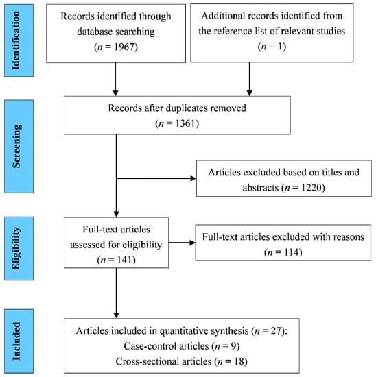 In the first step of searching for published studies, 1967 articles were selected from the proposed search databases, and 1 [43] from the listed references in 1 of those articles [44]. After careful review, we excluded 607 duplicate articles and 1220 articles that did not meet the inclusion criteria (assessed by their study titles and abstracts). Of the 141 articles, we further excluded 114 articles without detail or eligible data for meta-analysis due to unsearchable full-texts (n = 11), animal or cellular studies (n = 13), reviews (n = 48), and others (n = 42). Finally, 27 articles [15,17,18,19,22,23,24,25,26,43,44,45,46,47,48,49,50,51,52,53,54,55,56,57,58,59,60] were included in the meta-analysis (Figure 1).