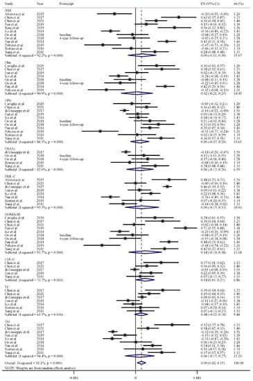 Figure 3 indicates that SELENOP was positively and significantly correlated with the body mass index (BMI), fasting insulin (FIns), fasting plasma/serum glucose (FPG), hemoglobin A1c (HbA1c), high-density lipoprotein cholesterol (HDL-C), homeostasis model assessment of insulin resistance (HOMA-IR), low-density lipoprotein cholesterol (LDL-C), total cholesterol (TC) [22], and triglyceride (TG) (pooled ES = 0.09, 95% CI: 0.02 to 0.15, n = 75). The inter-study heterogeneity across the studies was significant (I2 = 92.1%, p = 0.000, Figure 3). In the subgroup analysis, a positive and significant correlation was only observed between SELENOP and LDL-C (pooled ES = 0.14, 95% CI: 0.01 to 0.27, n = 5, I2 = 73.7%, p = 0.004), but there were significant correlations observed with any other GLM markers. Sensitivity analyses were performed, and the results remained consistent with the pooled effect.