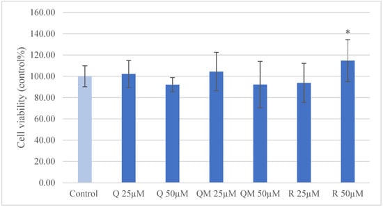 Viability of porcine intestinal epithelial cells (IPEC-J2) after treatment with different concentrations (25 µM and 50 µM) of quercetin (Q), 3-o-methylquercetin (QM) and rhamnazin (R). Data are shown as means with standard deviations (n = 6/group; * p < 0.05) in control percentage.