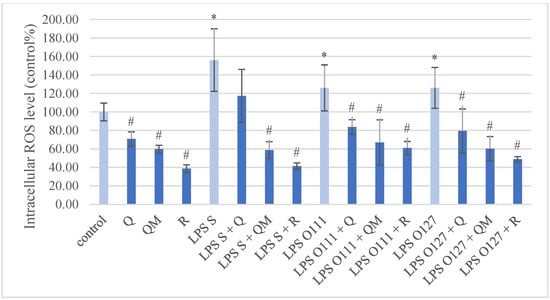 Intracellular reactive oxygen species level in porcine intestinal epithelial cells (IPEC-J2) after treatment with different types of lipopolysaccharides (LPS) from Salmonella Typhimurium (LPS S), E. coli O111:B4 (LPS O111), and E. coli O127:B8 (LPS O127) in 10 µg/mL concentration; quercetin (Q), 3-o-methylquercetin (QM) and rhamnazin (R) in 50 µM concentration; and their combinations. Data are shown as means with standard deviations (n = 6/group; * significantly higher p < 0.05; # significantly lower p < 0.05) in control percentage and are statistically compared to those of the control group.
