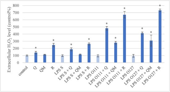 Using the Amplex Red Hydrogen Peroxide/Peroxidase Assay Kit, the extracellular H2O2 level showed a significant increase after the Q and R (50 µM) treatments compared to the control group (Figure 4). With a similar comparison, there was no significant alteration in H2O2 quantity after the different types of LPS treatment. However, all the simultaneous treatments increased the H2O2 level significantly, except for the QM and S. Typhimurium LPS combination. QM per se did not cause a significant change compared to the control group.