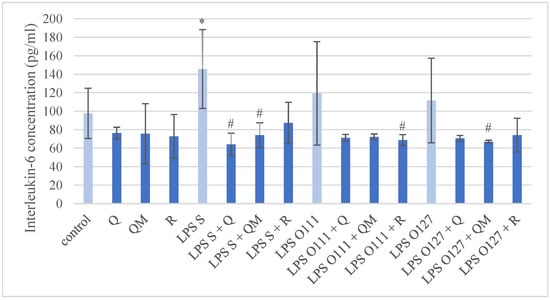 Interleukin-6 (IL-6) concentration in porcine intestinal epithelial cells (IPEC-J2) after treatment with different types of lipopolysaccharides (LPS) from Salmonella Typhimurium (LPS S), E. coli O111:B4 (LPS O111), and E. coli O127:B8 (LPS O127) in 10 µg/mL concentration; quercetin (Q), 3-o-methylquercetin (QM) and rhamnazin (R) in 50 µM concentration; and their combinations. Data are shown as means with standard deviation (n = 6/group; * significantly higher p < 0.05; # significantly lower p < 0.05) and are statistically compared to those of the control group.