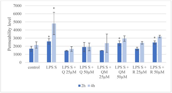 Partial disruption of the epithelial monolayer was investigated following 2 and 4 h after S. Typhimurium LPS treatment (Figure 6). Compared to the untreated samples, the fluorescence intensity of FD4 in the basolateral chamber was significantly higher after LPS treatment at both time appointments. The lower concentration (25 µM) of Q, QM, and R combined with LPS did not cause significant alteration in fluorescence intensity of FD4 at both time appointments. The simultaneous treatments of LPS with QM and R in 50 µM concentration at 2 h significantly increased the presence of the FD4 tracer compared to the control group, however it was not observed at 4 h.
