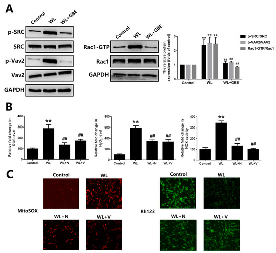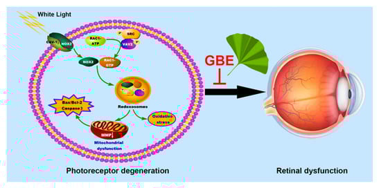 To assess the molecular mechanism underpinning the cellular protective effect of GBE, oxidative stress and mitochondrial function analyses were conducted. Our data showed that WL illumination (4000 lux for 30 min or 24 h) significantly induced intracellular ROS, H2O2 generation and NOX activation and dysregulated mitochondrial function, as shown by increased mitochondrial ROS and decreased MMP in 661W cells. However, GBE pre-treatment (100 mg/L for 24 h) significantly attenuated WL-induced oxidative stress and mitochondrial dysfunction (Figure 3A,B). In mice, WL illumination (50,000 lux for 8 h/5 days) markedly upregulated the expression of 8-OHdG (ROS marker) in photoreceptors (rhodopsin staining); however, GBE treatment (100 mg/kg/day for 10 days) attenuated its expression in WL-exposed mice (Figure 3C). In addition, the role of redoxosomes in GBE’s antioxidant effect was evaluated. In 661W cells, WL illumination (4000 lux for 1 h) induced the phosphorylation of SRC tyrosine and Vav2 tyrosine, which, in turn, increased the expression of active Rac1-GTP and led to NOX activation. The pre-incubation of Rac1 inhibitor (NSC23766, 80 µM, 6 h) or NOX inhibitor (VAS2870, 10 µM, 6 h) could effectively protect the cells from WL-induced oxidative stress and mitochondrial dysfunction. Since GBE attenuated redoxosome activation, this suggested that GBE likely alleviated WL-induced oxidative stress and mitochondrial dysfunction in a redoxosome-dependent manner (Figure 4).