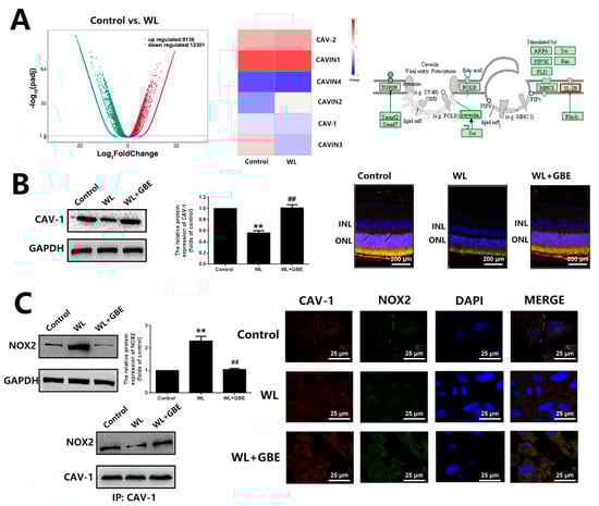 The influence of GBE on CAV-1 expression and CAV-1-NOX interaction in 661W cells and C57BL/6J mice exposed to WL illumination. (A) Transcriptome sequencing was performed on 661W cells pre-treated with or without GBE (100 mg/L, 24 h) exposed to WL (4000 lux) for 2 h. Volcano plots of the differentially expressed genes (DEGs) (left panel). Heatmap analysis of significantly changed caveolae-related genes (middle panel). KEGG pathway enrichment analysis of caveolae-related genes (right panel). (B) The 661W cells pre-treated with GBE (100 mg/L 24 h) were exposed to WL (4000 lux) for 2 h, and the expression of CAV-1 was assessed by Western blot analysis (left panel). The relative expression of CAV-1 is shown in the middle panel. Retinal tissues from mice with the indicated treatments were co-stained with DAPI (blue fluorescence), CAV-1 (red fluorescence) and rhodopsin (green fluorescence) (right panel). (C) The influence of GBE on NOX2 expression is shown in the left upper panel; the densitometry analysis of protein expression is shown in the right upper panel. CAV-1-NOX2 interaction was evaluated by co-immunoprecipitation (bottom-left panel). The protein lysate was pulled down by anti-CAV-1 antibody and then the samples were detected with anti-NOX2 antibody. The co-localization of CAV-1 (red fluorescence) and NOX2 (green fluorescence) was indicated with immunofluorescence staining (right panel). ** p < 0.01 vs. Control, ## p < 0.01 vs. WL. WL: white light, INL: inner nuclear layer, ONL: outer nuclear layer.