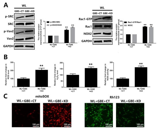 To investigate the regulators involved in redoxosome activation, bioinformatic analysis and a co-immunoprecipitation assay were conducted. According to the bioinformatic analysis, there were 21,437 differentially expressed genes (DEGs) identified when comparing the WL group with the control group, among which, CAV-1 was significantly downregulated in both in vitro (4000 lux for 2 h) and in vivo models (50,000 lux for 8 h/5 days) exposed to WL. The co-immunoprecipitation assay showed that NOX2 was bound to CAV-1 in 661W cells, and the downregulation of CAV-1 in the WL-induced group was accompanied by the upregulation and relocation of NOX2 from the membrane to the cytoplasm as well as the formation and activation of redoxosomes (SRC-Vav2-Rac1-NOX). However, the pre-treatment with GBE (100 mg/L for 24 h) in WL-exposed cells (4000 lux for 2 h) reversed the altered expression of both proteins, as well as the relocation of NOX2, and subsequently blocked the formation of redoxosomes (Figure 5). In addition, CAV-1 silencing in 661W cells prohibited the suppressive effects of GBE on redoxosome activation, oxidative stress and mitochondrial dysfunction, suggesting that the impact of GBE on redoxosome activation was likely mediated by modulating the expression of CAV-1 and influencing the interaction of CAV-1 and NOX2 (Figure 6).