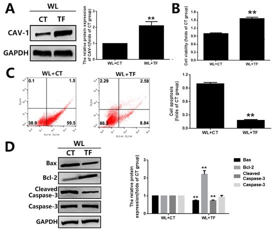 The effect of CAV-1 overexpression on photoreceptor degeneration in 661W cells exposed to WL illumination. (A) The overexpression of CAV-1 was verified by Western blot analysis. Cells from the 661W cell line overexpressing CAV-1 were exposed to WL (4000 lux) for 2 h. (B) Cell viability was assessed by MTT assay. (C) Cell apoptosis was analyzed by Annexin V-FITC and PI double-staining assay. Representative images of cell death profiles are shown on the left. The percentages of apoptotic cells are summarized in the right panel. (D) The expressions of apoptosis-related proteins (Bax, Bcl-2 and Caspase-3) were evaluated by Western blot analysis (left panel). The densitometry analysis of these proteins is shown in the right panel. ** p < 0.01 vs. WL + CT. WL: white light, CT: 661W cells without CAV-1 transfection, TF: 661W cells with CAV-1 transfection.
