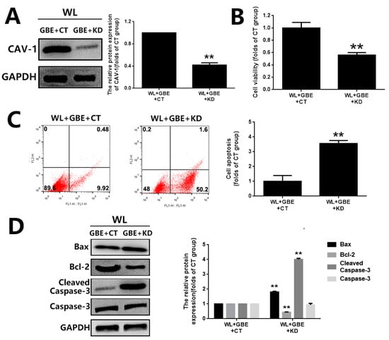 CAV-1 silencing attenuated the cytoprotective effect of GBE on photoreceptor degeneration in 661W cells exposed to WL illumination. The 661W cells with or without CAV-1 silencing were pre-treated with GBE (100 mg/L, 24 h) and then exposed to WL (4000 lux) for 2 h. (A) The silencing of CAV-1 was verified by Western blot analysis. (B) Cell viability was assessed by MTT assay. (C) Cell apoptosis was analyzed by Annexin V-FITC and PI double-staining assay. Representative images of cell apoptotic profiles are shown on the left. Percentages of apoptotic cells are summarized in the right panel. (D) The expressions of apoptosis-related proteins (Bax, Bcl-2 and Caspase-3) were evaluated by Western blot analysis (left panel). The densitometry analysis of each protein is shown in the right panel. ** p < 0.01 vs. WL + GBE + CT. WL: white light, CT: 661W cells without CAV-1 silencing, KD: 661W cells with CAV-1 silencing.