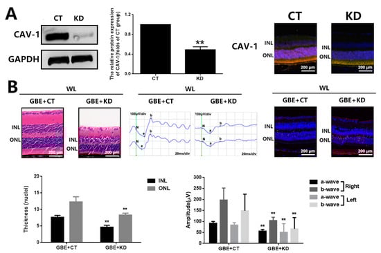 CAV-1 silencing attenuated the protective effect of GBE on photoreceptor degeneration in C57BL/6J mice exposed to WL illumination. (A) The silencing of CAV-1 in mouse retinas was verified by Western blot analysis (left and middle panels) and immunofluorescence staining (DAPI: blue fluorescence, CAV-1: red fluorescence, rhodopsin: green fluorescence) (right panel). (B) Mice with or without CAV-1 silencing were orally administered GBE (100 mg/kg body weight/day for 5 days) and then exposed to WL (50,000 lux) for 8 h/5 days with continuous GBE treatment. Retina structure was assessed by HE staining (left panel). Retina function was assessed by ERG analysis (middle panel). Photoreceptor apoptosis was assessed using TUNEL staining in the right panel (TUNEL: red fluorescence, DAPI: blue fluorescence). ** p < 0.01 vs. GBE + CT. WL: white light, INL: inner nuclear layer, ONL: outer nuclear layer, CT: Control, KD: CAV-1 silencing.