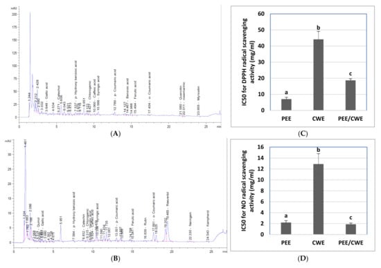 The current results demonstrated that PEE and CWE contain various phytochemical constituents, minerals, and vitamins with different concentrations, as shown in Table 2. PEE contains a higher content of total phenolics and flavonoids and represents a higher yield than CWE. Additionally, the HPLC analysis of PEE revealed the presence of many phenolic and flavonoid compounds, where benzoic acid, p-hydroxybenzoic acid, myricetin, quercetin, rosmarinic acid, catechol, syringic acid, chlorogenic acid, p-coumaric acid, and gallic acid exist in great amounts. At the same time, only resveratrol and naringin are present in CWE in a large amount (Figure 2A,B and Table 2).