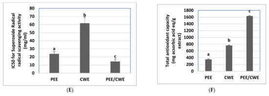 The total phenolic content of PEE and CWE was determined using the Folin–Ciocalteau colorimetric method []. The resulted blue color was measured at 760 nm against a blank reagent, where gallic acid was employed as standard. Total flavonoid content was quantified calorimetrically using the aluminum chloride method, and catechin was used as standard []. Data are expressed as mg equivalent/g extract.