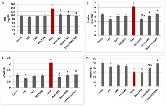 The FBG and insulin levels in the Dexa-injected group displayed a significant increase accompanied by a significant elevation in HOMA-IR level and a significant reduction in HOMA-β level versus the control group (p < 0.05; Figure 3). In contrast, the administration of PEE, CWE, or their combination for eight constitutive weeks to Dexa-injected rats significantly (p < 0.05) reduced the FBG, insulin, and HOMA-IR levels relative to the Dexa-untreated group. Furthermore, the CWE and PEE/CWE treated groups showed a significant increase in the HOMA-β index compared to both the Dexa and PEE + Dexa groups. Moreover, the Dexa + PEE/CWE group reached levels comparable to the control group (Figure 3). Interestingly, the combination of PEE and CWE showed a synergistic (CI < 1) effect for all the studied glycemic markers, except for the HOMA-β index, which showed an antagonistic effect (CI > 1; Table 3). Therefore, long-term Dexa administration may indirectly promote male infertility via hyperglycemia. In contrast, PEE/CWE may improve male fertility via effects on circulating glucose and insulin levels.