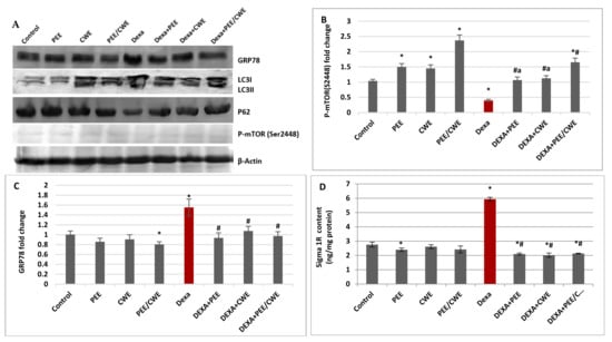 Folin–Ciocalteau reagent, aluminum chloride, nitroblue tetrazolium (NBT), 1-1-diphenyl 2-picrylhydrazyl (DPPH), phenazine methosulfate (PMS), nicotinamide adenine dinucleotide reduced (NADH), gallic acid, catechin, thiobarbituric acid, trichloroacetic acid (TCA), Cumene H2O2, Tris-HCl, 5,5′-dithio-bis-2-nitrobenzoic acid (DTNB), reduced glutathione (GSH), Griess reagent (Sulphanilamide and N-1-naphthyl ethylenediamine), sulfosalicylic acid, and dexamethasone (Dexa) were obtained from Sigma-Aldrich (St. Louis, MO, USA). ELISA kits were purchased from COBAS, USA. Other assay kits were purchased from Spectrum, Egypt. Easy redTM total RNA extraction kit, cDNA synthesis kit, and 2X SYBR green master mix kit were obtained from iNtRON Biotechnology, Korea. Primers were purchased from Invitrogen, Thermo Fisher Scientific, Waltham, MA, USA. The following antibodies were used: Anti-beclin-1 (PRS3613, Sigma-Aldrich, Merck KGaA, Darmstadt, Germany), phosphoinositide-3-kinase class 3 (Anti-PI3KC3, abx329840, Abbexa Ltd., Cambridge, UK), Anti-Sigma R1 polyclonal antibody (abx241819, Abbexa Ltd., Cambridge, UK), Phospho-mTOR (Ser2448) (2971, Cell signaling technology), Anti-P62/SQSTM1 (D1Q5S) rabbit mAb (39749, Cell Signaling Technology, Danvers, MA, USA), LC3B antibody-N-terminal (ab229327, Abcam, Cambridge, UK), glucose-regulated protein 78 (GRP78) polyclonal antibody (Invitrogen, Thermo Fisher Scientific Inc., Waltham, MA, USA, PAS-85169), and β-actin (antibody, Genie, Redmond, WA, USA, CABC026). Other chemicals were obtained with high grades.