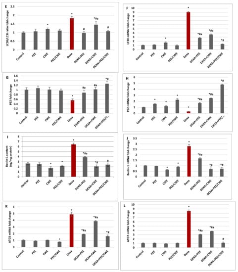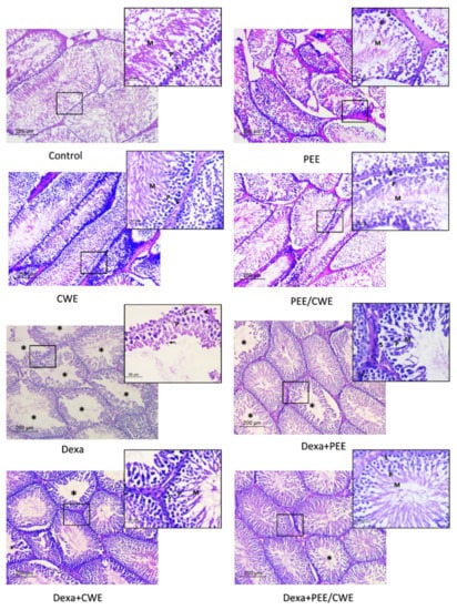 After one week of acclimatization, rats were divided into eight groups (8 animals/group) and treated for 8 weeks. There are four control groups that received saline (Sham), PEE (100 mg/kg), CWE (100 mg/kg), and PEE/CWE combined (100 mg/kg), daily for eight weeks. Infertility-induced group: received dexamethasone (Dexa, 1 mg/kg, sc, dissolved in saline) daily for six weeks. There are three treated groups that received: PEE (Dexa + PEE, 100 mg/kg), CWE (Dexa + CWE, 100 mg/kg), and PEE/CWE combined (Dexa + PEE/CWE, 1/4, 20/80 mg/kg). The animals of the treated groups were continuously administered their respective treatments via gavage daily for two weeks before Dexa and continued for another six weeks with Dexa. Based on earlier studies, a daily dose of 100 mg/kg of either PEE or CWE was chosen [,,].