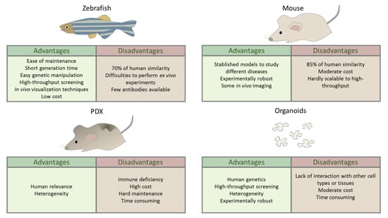 Advantages and disadvantages of zebrafish model compared with mouse, patient-derived xenograft (PDX), and human organoid models.