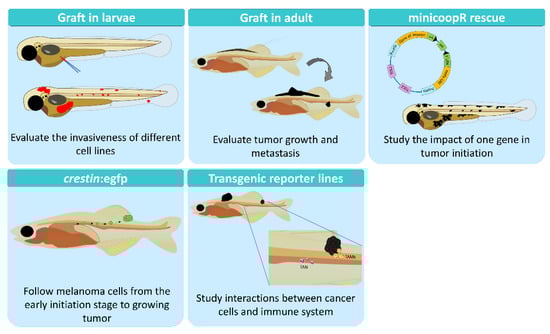 In summary, the unique advantages of zebrafish for in vivo imaging together with the ease of genetic manipulation and the high throughput drug screening make this model a key tool for study of cancer, more specifically melanoma [54]. Zebrafish facilitate the study of melanoma initiation, using casper zebrafish or the recent zebrafish model crestin:eGFP, including the monitoring of the development, tumor growth, and metastasis in adult stages. It also makes it easier than other models to study the invasiveness potential and drug resistance of patient tumor cells using xenografts in larvae (Avatar models), and it makes easier the generation of genetic mutants to study the impact of a GOI on melanoma development. In addition, the recent development of the MinicoopR system makes it possible to study the impact of a GOI on tumor biology from early initiation to tumor development.