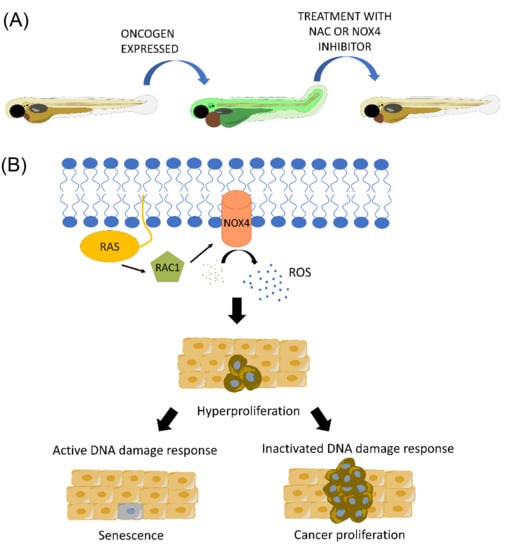 Another important observation made in vivo for the first time using the transparency of zebrafish is that oncogenic RAS induces ROS that eventually leads to a DNA damage response and aberrant cell proliferation [109] (Figure 4). Mechanistically, RAS-induced ROS are produced by NAPDH oxidase 4 (NOX4) and ROS scavengers, and NOX4 inhibition rescues a cell from death and larval malformations promoted by the overexpression of oncogenic RAS [109]. These results may be of clinical relevance since NOX4 is increased in human pancreatic tumors, and specific inhibition of NOX4 with small molecule inhibitors act synergistically with chemotherapeutic agents in mouse models of this type of cancer [109].