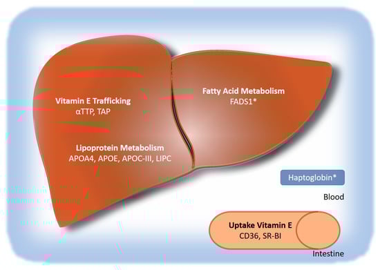 The intestinal uptake of vitamin E is mediated by scavenger receptor class B member 1 (SR-BI), cluster of differentiation 36 (CD36), and NPC1-like intracellular cholesterol transporter 1 (NPC1L1) [,,]. Not surprisingly, SNPs in both SR-BI (rs11057830, “Exon-8”) as well as CD36 (rs1527479) have been associated with vitamin E levels. For SR-B1, as well as CD36, the minor alleles are associated with a decrease in vitamin E circulatory levels [,,]. After enteral uptake, vitamin E is transported to the liver in chylomicrons, which are then taken up into the liver by LDL receptor-related proteins (LRP), which is a step that also involves hepatic lipase (LIPC) []. A SNP in LIPC (rs1800588) is associated with higher circulating vitamin E levels [], which may be caused by a less efficient hepatic uptake of vitamin E from chylomicrons and a transfer of vitamin E from chylomicrons to other lipoproteins without hepatic involvement.