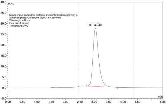 Extraction rendered a single purified substance with absorption at 457 nm, as shown by the one peak with a retention time of 3.040 min in the chromatogram (Figure 1). Based on our previous experience with this extract, we could confirm that this represented bixin [37]. The process yield was 98%.