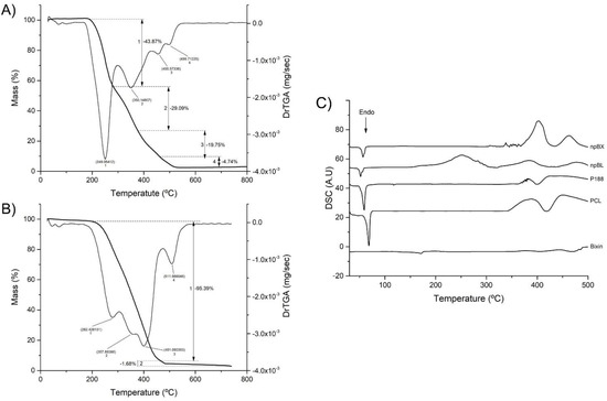 Thermogravimetric analysis (TGA) and differential scanning calorimetry (DSC) were performed on npBX and npBL. Samples were placed in an alumina crucible and subjected to thermal gravimetric analysis (Shimadzu®, model TGA 51, Kyoto, Japan) with a temperature range from 27 °C up to 1200 °C with an incremental increase in heat of 10 C/min in an inert nitrogen atmosphere at a gas flow of 50 mL/min. For DSC analysis (Shimadzu®, model DSC 60 PLUS), samples were packed into an aluminum pan, heated up to 90 °C, cooled to room temperature and then heated again up to 600 °C (with the heat increasing at a rate of 10 °C per minute) in an inert nitrogen atmosphere at 50 mL/min.