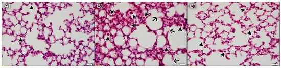 As anticipated, the lung parenchyma was preserved in animals exposed to ambient air and npBL (Figure 4A), with only a few resident leukocytes, indicating npBL administration did not disrupt basal morphology or cause notable inflammation. Figure 4B shows the lung parenchyma of mice exposed to CS and npBL, revealing that although alveolar spaces are similar to the control group, considerable leukocyte infiltration (arrowheads) is evident. In addition, septal exudate could be observed, confirming acute inflammation. Arrows indicate early stages of alveolar septa disruption, indicative of the onset of structural damage associated with CS exposure. Importantly, CS-exposed mice treated with the highest dose of npBX (CS + npBX 18%) showed similar histological characteristics as the control group, with preserved alveolar spaces and basal leukocyte levels and without any visible signs of inflammation (Figure 4C).