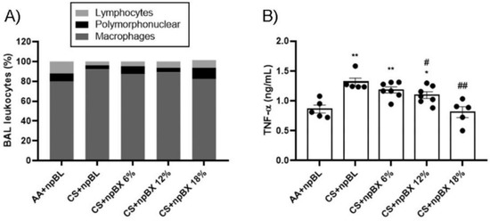 To investigate if npBX treatment was able to prevent the characteristic increase of leukocytes in BALF of mice with ALI, total and differential cell counts were performed (Figure 5A, Table 2). The CS + npBL group showed an increase in alveolar leukocytes when compared to the AA + npBL group. This was significantly reduced in a dose-dependent manner with npBX treatment, confirming the histological data that indicated inhibitory effects of npBX on CS-induced immune cell migration to the lung parenchyma. Differential cell counts indicated an increase in macrophages in BALF in CS + npBL, which could be prevented with the administration of the highest doses of npBX (12% and 18%). No significant differences could be detected in BALF neutrophil numbers between the AA + npBL and CS-exposed groups.