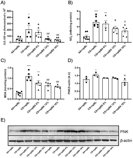 PNK is a marker of nitrosative damage and is formed as a result of peroxynitrite (ONOO−) nucleophilic attacks on protein tyrosine residues. Therefore, PNK protein expression was evaluated by Western blotting. Lung tissue homogenates from CS + npBL animals showed a modest increase in PNK expression compared to controls. In animals treated with npBX, PNK expression was maintained at basal levels (Figure 6D–E).