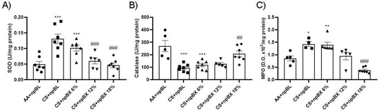 Evaluation of the endogenous antioxidant system was performed through SOD and CAT enzyme activity assays using lung tissue homogenates (Figure 7A,B). These demonstrated an increase in SOD activity and a reduction in CAT in the CS + npBL compared to the control group. This antioxidant disbalance was completely abolished with the highest dose of npBX (CS + npBX 18%). MPO activity was assessed in BALF as an inflammatory and redox marker once it can generate reactive chlorine species [45]. CS + npBL animals showed an increase in MPO activity compared to controls, which was effectively prevented when mice were treated with the highest dose of npBX (18%) (Figure 7C).
