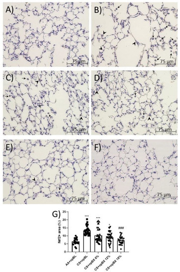 Immunohistochemistry for Nrf2. Lung sections stained for Nrf2 of (A) AA + npBL, (B) CS + npBL, (C) CS + npBX 6%, (D) CS + npBX 12%, (E) CS + npBX 18% and (F) negative control (lacking the primary antibody) mice. (G) Quantification of positive cells. Arrows and arrow heads indicate Nrf2+ cells into the alveolar space and in alveolar sept, respectively. Scale bar: 75 µm. Original magnification: 40x. * p < 0.05 and *** p < 0.001 compared to AA + npBL; ### p < 0.001 compared to the CS + npBL group.