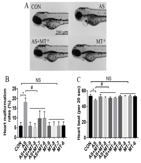 The effects of melatonin on the NaAsO2-induced heart malformations in zebrafish embryos at 72 hpf. (A) Images of zebrafish. (B) Heart malformation rate. (C) Heart rate. CON: system water as the vehicle control; AS: NaAsO2 at 1.0 mM; MT−9, MT−8, MT−7, MT−6: Melatonin at 10−9, 10−8, 10−7, 10−6 M; * p < 0.05, compared to CON; # p < 0.05, compared to MT; NS, compared to CON.