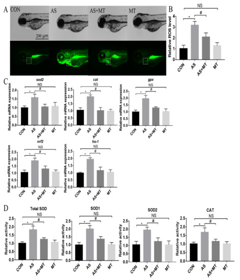 The effects of melatonin on the NaAsO2-induced oxidative stress changes in zebrafish embryos at 72 hpf. (A) ROS signals in the heart area and heart regions are represented by the dotted squares. (B) Quantification of ROS signals in heart area. (C) Relative expression levels of oxidative stress-related genes. (D) Relative enzyme activities. CON: system water as the vehicle control; AS: NaAsO2 at 1.0 mM; MT−9: Melatonin at 10−9 M. * p < 0.05, compared to CON; # p < 0.05, compared to MT; NS, compared to CON.