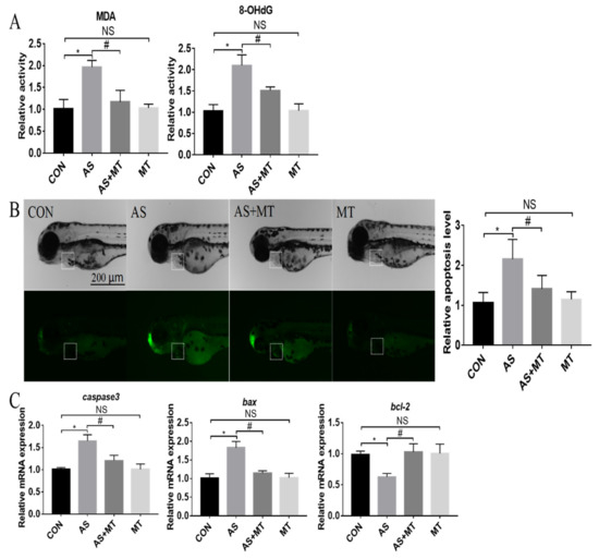 The effects of melatonin on the NaAsO2-induced oxidative damage and apoptosis changes in zebrafish embryos at 72 hpf. (A) Oxidative damage in zebrafish embryos. (B) Representative images stained by AO and the quantification of apoptosis signals in heart area. Heart regions are represented by the dotted squares. (C) Relative expression levels of apoptosis-related genes. CON: system water as the vehicle control; AS: NaAsO2 at 1.0 mM; MT−9: Melatonin at 10−9 M. * p < 0.05, compared to CON; # p < 0.05, compared to MT; NS, compared to CON.